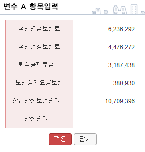 또한 하단에 있는 항목입력버튼을 클릭하면 자동으로 A값에 대한 항목들이 보여지며, 적용버튼을 누르면 A값이 계산기에 적용이 됩니다.