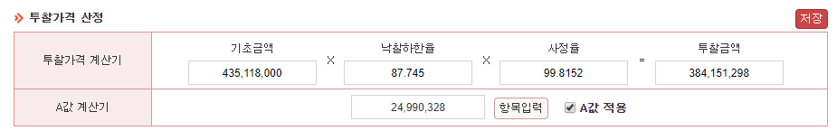 사정율을 입력 한 뒤, A값적용버튼을 클릭하면 바로 A값이 적용된 투찰금액을 산출 할 수 있습니다.